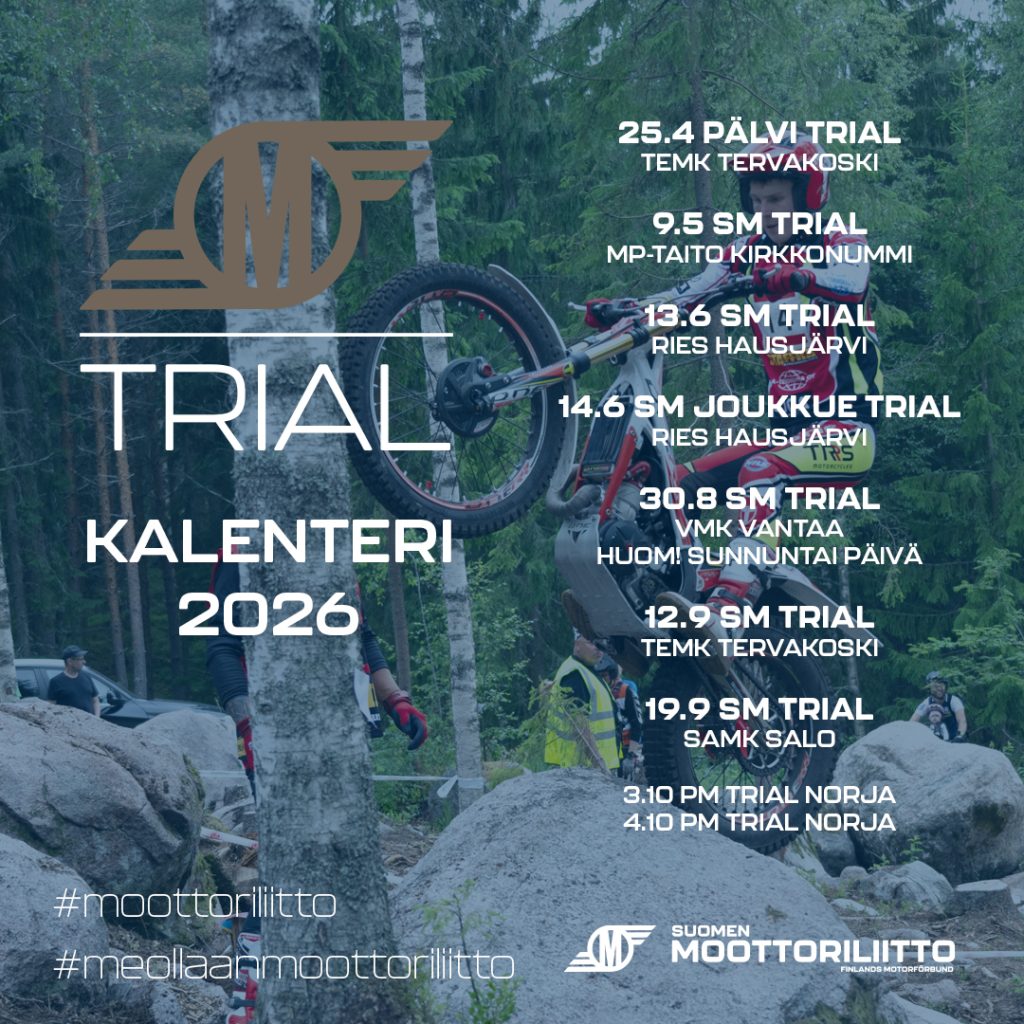 Lisätietoja saat trial lajiryhmältä trial.lajiryhma@moottoriliitto.fi