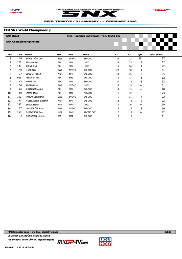 Vuoden 2026 Snowcrossin MM-kisojen ensimmäinen osakilpailu ajettiin viikonloppuna Rize Handüzün luonnonpuistossa Turkin koillisosassa, lähellä Mustanmeren rannikkoa! Sää häiritsi kilpailua päivän alussa aiheuttaen näkyvyysongelmia, jotka johtivat viivästyksiin ja punaisiin lippuihin naisten Snowcrossin MM-sarjan ensimmäisessä osakilpailussa. Sen jälkeen olosuhteet kuitenkin paranivat ja mahdollistivat koko päivän kestävän kilpailun suuren ja innostuneen yleisön edessä!