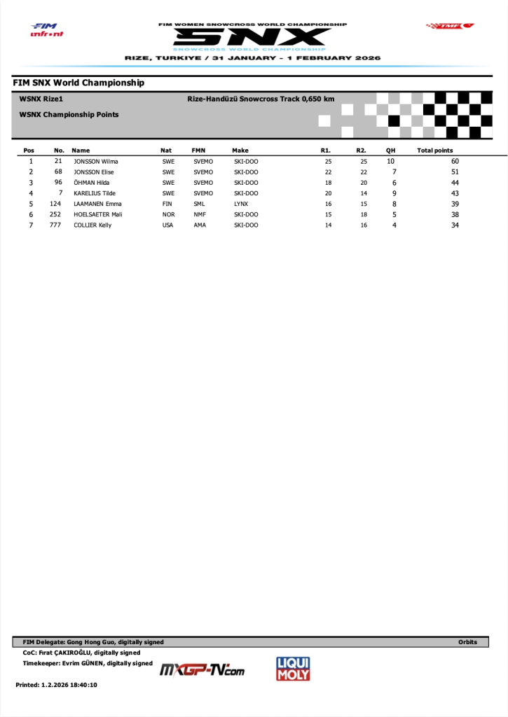 Naisten luokkaa hallitsi täysin toinen ruotsalainen Ski-doo-kuski, Wilma Jonsson. Hänellä oli täydellinen viikonloppu voitettuaan molemmat eilisen aika-ajot ja torjuttuaan nimikkoautonsa Elise Jonssonin haasteen. Suomen Emma Laamanen on ensimmäisen kisan jälkeen viidentenä.