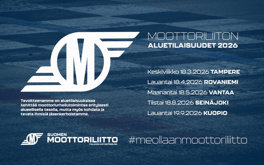 Kutsumme jäsenkerhomme mukaan aluetilaisuuksiin viidelle paikkakunnalle - Tampereelle, Rovaniemelle, Vantaalle, Seinäjoelle ja Kuopioon. Tavoitteenamme on aluetilaisuuksissa kehittää moottoriurheilutoimintaa erityisesti alueellisella tasolla, mutta myös kohdata ja tavata ihmisiä jäsenkerhoistamme.