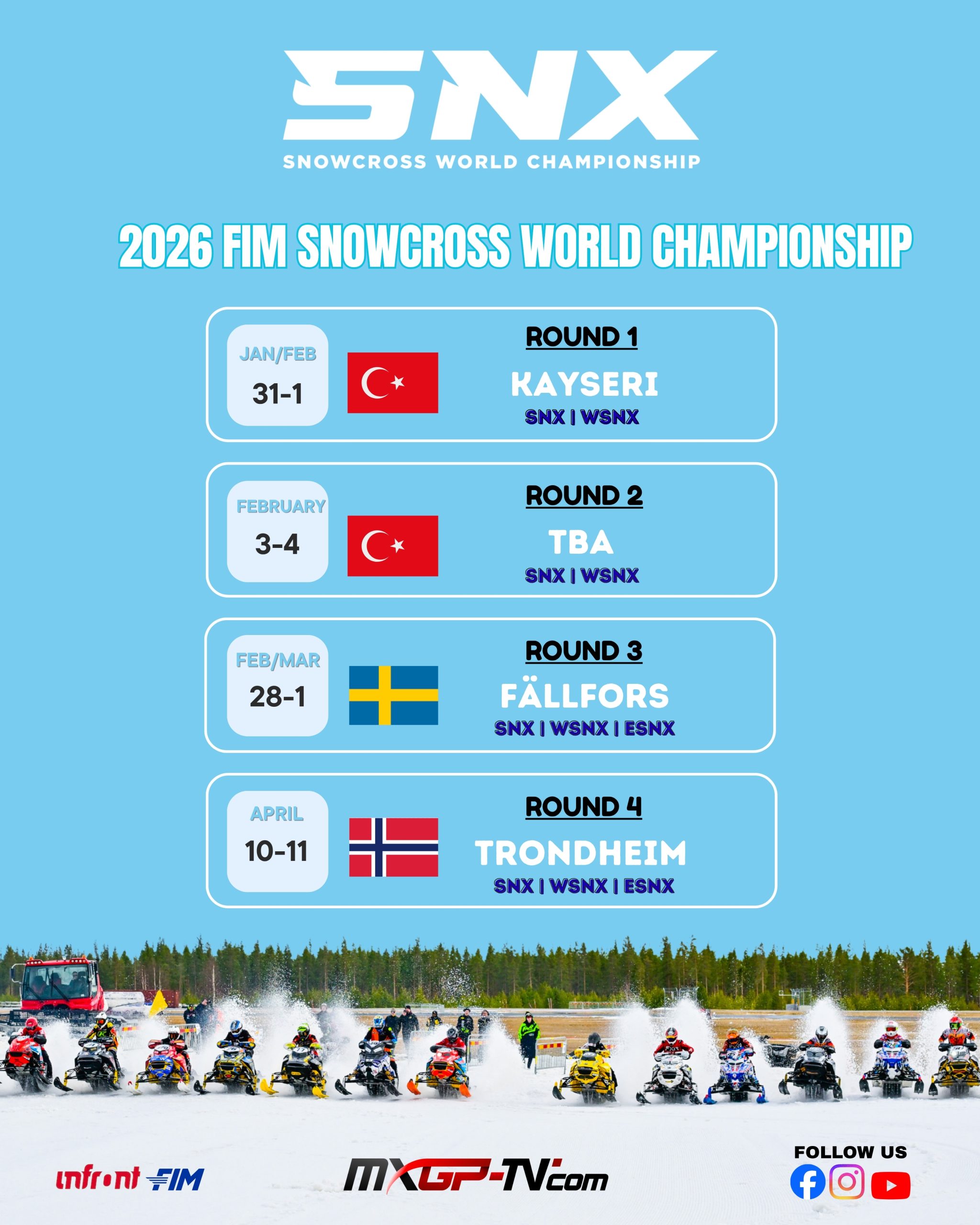 Lisätietoja 2025 FIM Snowcross World Championship -kilpailuista saat seuraamalla WorldSnowcross.com-sivustoa ja MXGP:n sosiaalisen median kanavia, mukaan lukien virallinen SNX Instagram -sivu osoitteessa WorldSnowcross.com