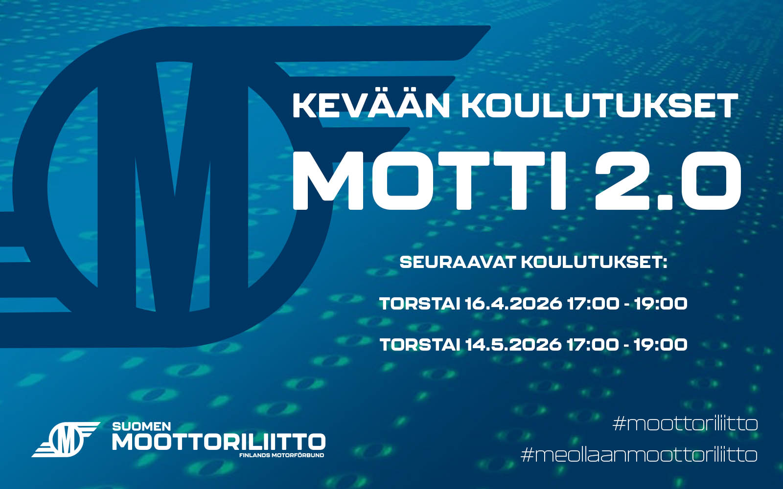Motti 2.0 koulutukset – Sama osallistumislinkki kaikkiin koulutuksiinSeuraavat koulutukset: torstai 16.4.2026 17:00 - 19:00 torstai 14.5.2026 17:00 - 19:00 Molemmat koulutukset on jaettu kahteen osaan. Kilpailunjärjestäjille 17-18 ja 18-19 kilpailijoille.