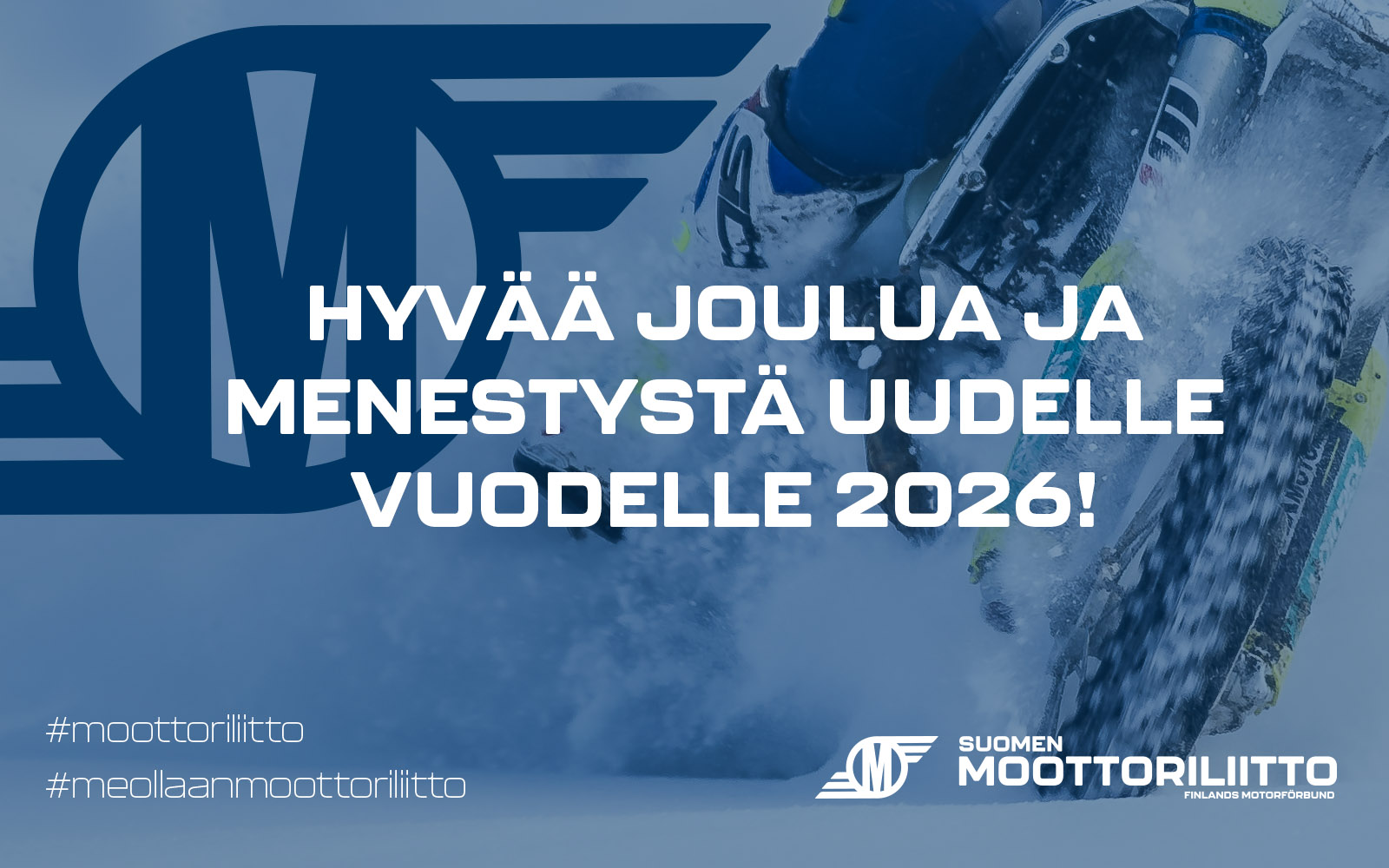 Hyvää joulua ja onnellista uutta vuotta 2026Joulun sekä uuden vuoden pyhien vuoksi Moottoriliiton toimisto on suljettuna 20.12.2025-28.12.2025 välisen ajan. Palvelemme etäyhteyksin 29.12.2025-30.12.2025 sekä perjantaina 2.1.2026. Normaaliin arkeen palaamme jälleen maanantaina 5.1.2026.