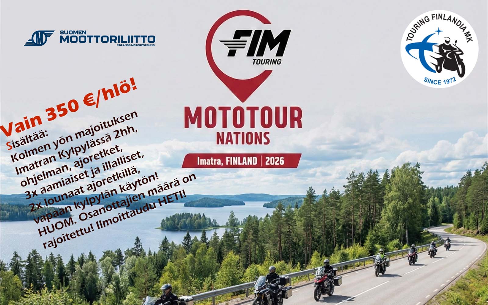 FIM Mototour of Nations Imatralla 11.–14.8.2026Suomen Moottoriliiton Non-sport työryhmä sekä sen Moto Guide Finland-koulutusjärjestelmä ovat vahvasti mukana tukemassa Imatralla elokuussa 2026 järjestettävää FIM Mototour of Nations- tapahtumaa.  Vastuullisena järjestäjänä toimii Touring Finlandia Moottorikerho ry.