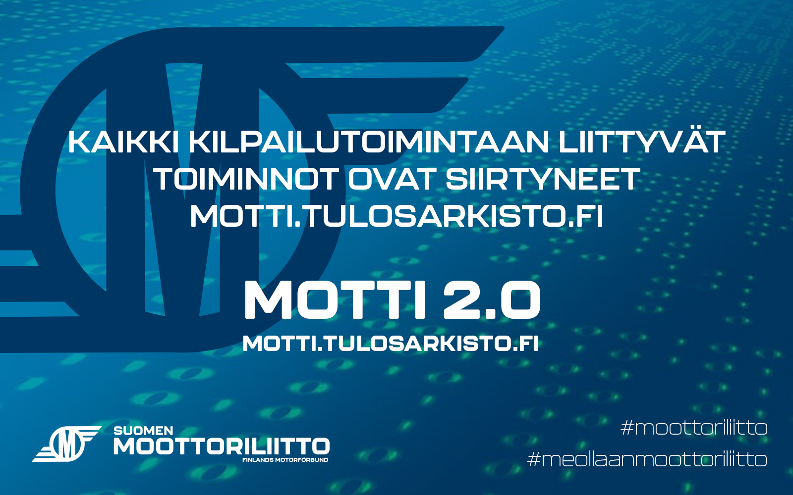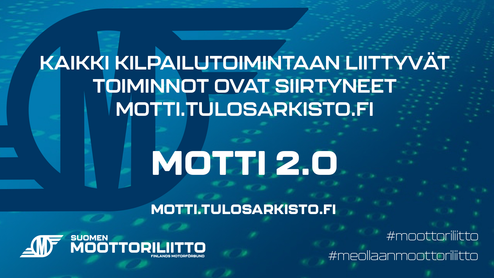 Kaikki kilpailutoimintaan liittyvät toiminnot löytyvät osoitteesta motti.tulosarkisto.fiKauden 2026 kilpailutoimintaan liittyvät toiminnot löytyvät uudistuneesta Motti 2.0 -palvelusta osoitteesta motti.tulosarkisto.fi. Kilpailijalisenssin voi nyt helposti ostaa hyödyntäen omaa tapaturmavakuutusta tai valita halutessaan SML:n ja Pohjolan tarjoaman sporttiturva-vakuutuksen. Kilpailuilmoittautumiset tapahtuu myös uudistuneessa palvelussa.