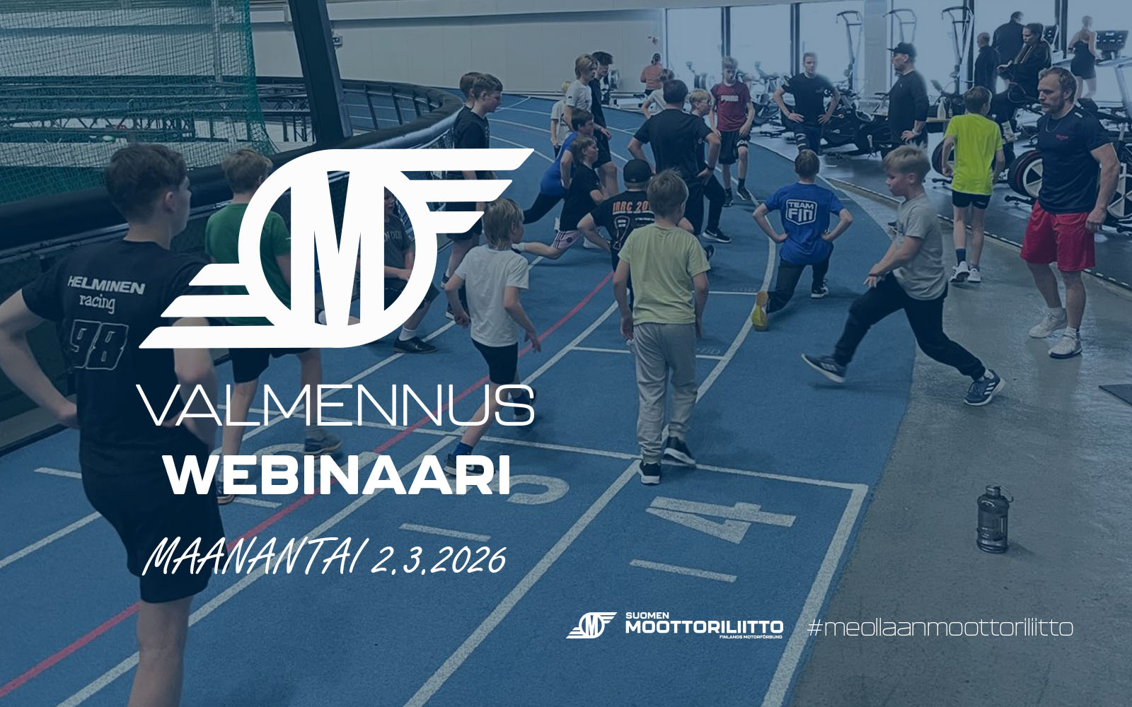 Moottoriliiton valmennuswebinaarisarja jatkuu maanantaina 2.3.2026Moottoriliiton valmennuswebinaarien seuraava osa pidetään ennakkotiedoista poiketen jo maanantaina 2.3.2026 klo. klo 18.00–20.00. Aiheina klo. 18.00–19.00 lasten ja nuorten harjoittelu. Keskustelua vanhemman roolista lapsen urheilemisessa. klo 19.00–20.00 käsitellään Moottoriliiton valmennuskokonaisuutta